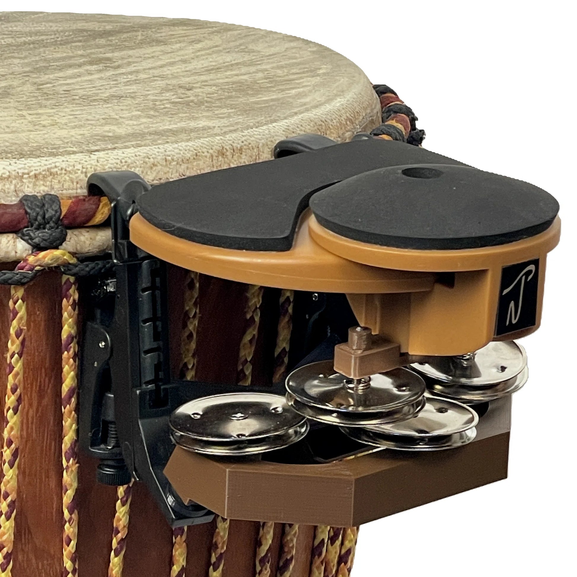 The RhymStryker mounting system allows for quickly mounting NTP RhymBlocks, RhymBells or RhymChiks in any position around the drum rim with height adjustability to place the hand striker at a suitable position and height above the rim for finger or palm play, enabling the player to incorporate woodblock and cowbell patterns simultaneously into their two-handed drum playing without the interruption of having to pick up, hold in hand, and place back down a striking stick.