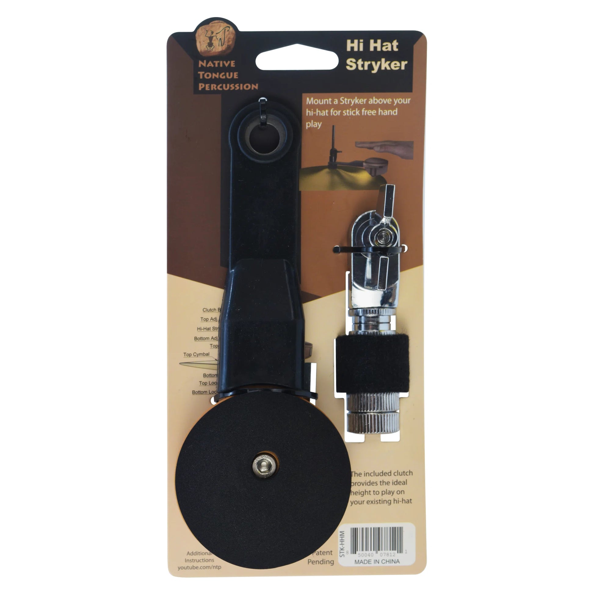 The Native Tongue Percussion Hi-Hat Stryker is an innovative patented hand striking system for hand percussionists to add hi-hat rhythms to their drum playing while freely maintaining two hand drum patterns without interrupted play by having to pick up and place back down a drumstick or limiting one of their hands to holding a drumstick.