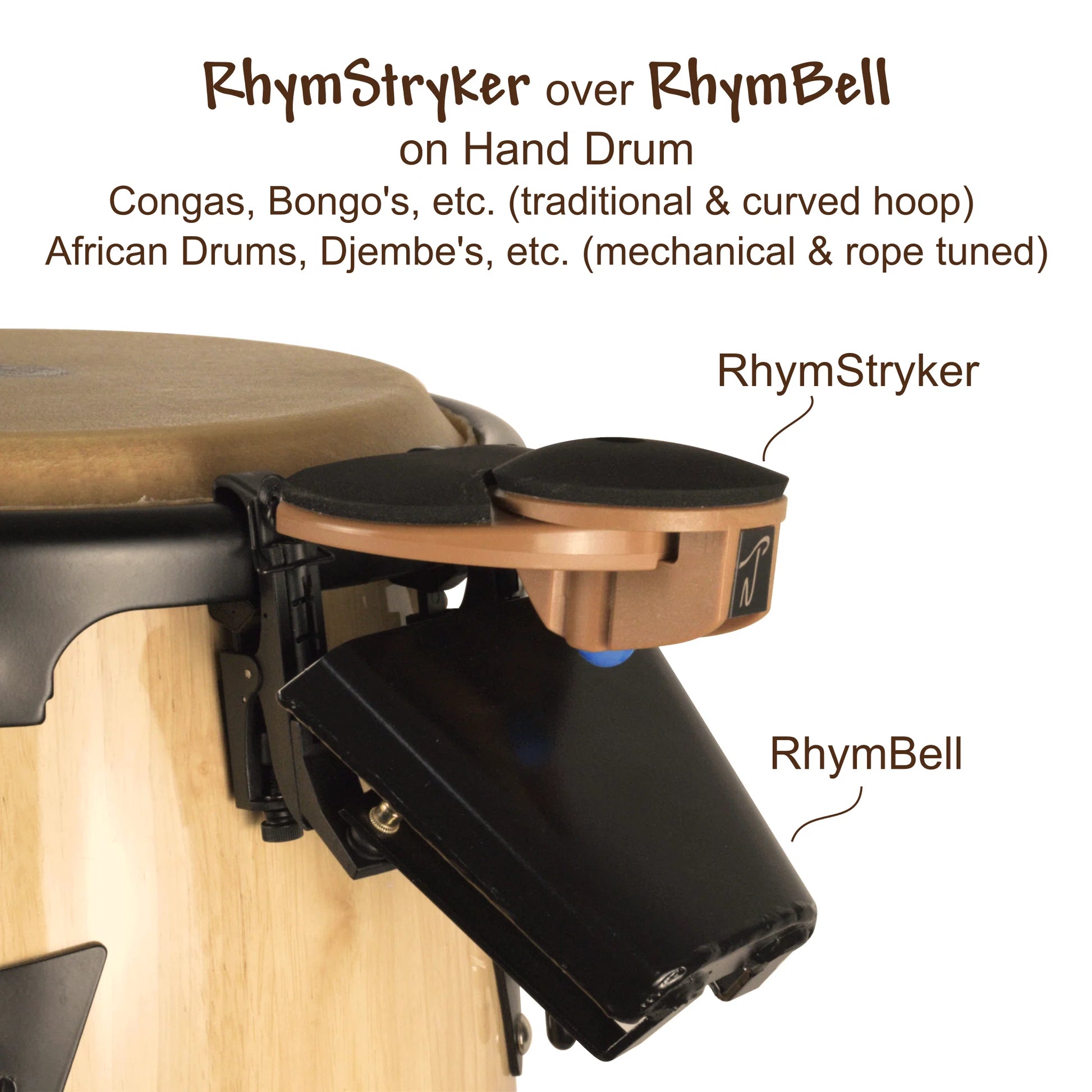 The RhymBell can be used with hand play by mounting onto an NTP RhymStryker (sold separately or bundled) designed to mount onto the rim of a hand drum, enabling the player to incorporate cowbell patterns into their two-handed drum playing without the interruption of having to pick up, hold in hand, and place back down a striking stick to play the cowbell.