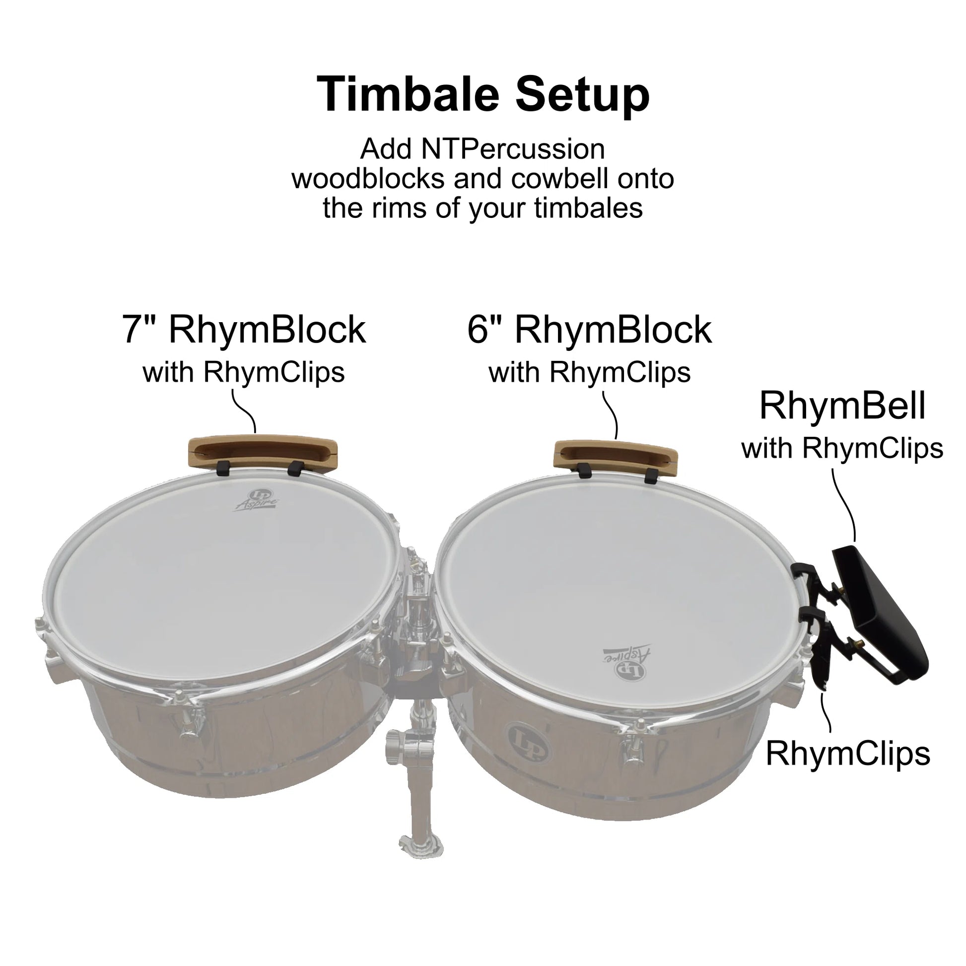 With the RhymClip stick play mounting system, the RhymBlock can quickly be mounted on and off most standard drum rims in any unobstructed position around the rim with height adjustment above the rim while the contoured shape maintains equal height and side distance parallel to the rim across the full width of the block. Ideal for rimshots, cross sticking, ghost noting, singular or interplay with the drum.